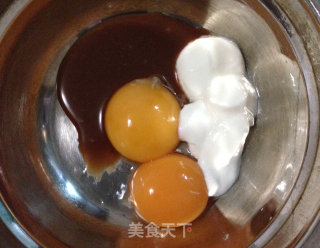 步骤1、蛋黄加入酸奶和焦糖酱打匀。