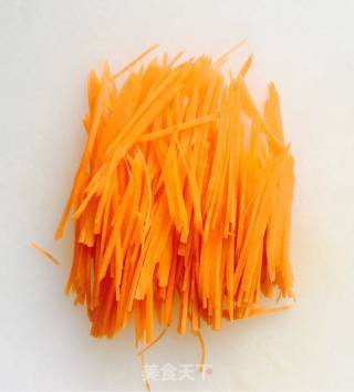 胡萝卜半根清洗干净削去外皮,先切成厚薄均匀的片再切成粗细均匀的胡萝卜丝