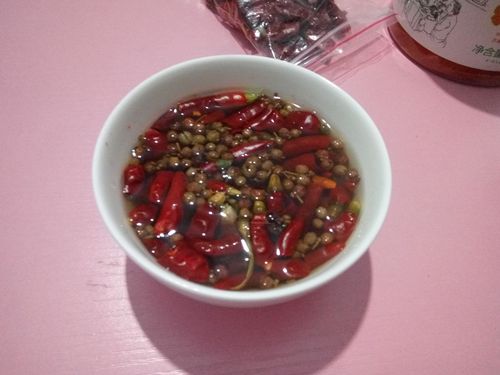 步骤2、 根据自己对辣度和麻度的喜好,取适量的花椒和辣椒放入碗中,加入开水浸泡15分钟左右,将水过筛掉,加入锅中