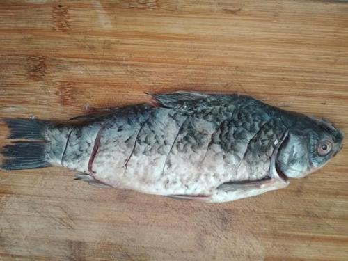 步骤1、将鱼清洗干净,擦干水分,在鱼背上划斜刀
