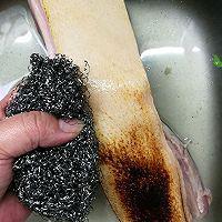 步骤2、 用清水冲洗,用钢丝球刷去黑色部分。这样处理后的猪肉不会有毛腥味。