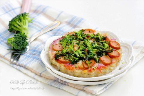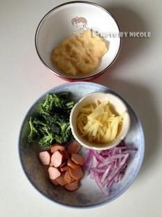 步骤1、西兰花掰成小朵,火腿切片,洋葱切丝,马苏切丝,土豆去皮擦成蓉