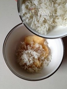 步骤2、将擦成茸的土豆挤去水分,与剩米饭混合