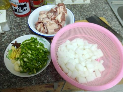 步骤1、鸭肉切块(去皮,鸭皮分开放) 萝卜切块 大蒜拍碎 姜切片 辣椒切条
