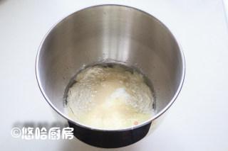 步骤2、搅拌缸中放入水、糖、盐、奶粉、面粉、酵母,用厨师机低速搅拌成团。