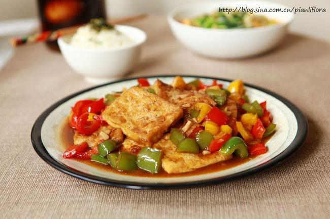 豆腐,青椒,红椒,黄椒,香葱,生抽