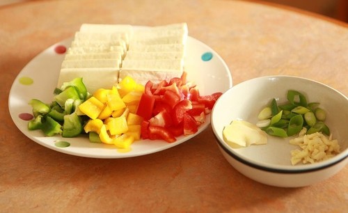 豆腐切厚片,彩椒切丁,香葱切葱花,姜切片,蒜切末备用。