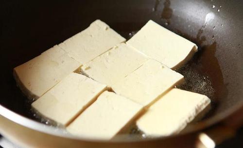 步骤2、锅内放入适量的油,待油热,放入豆腐片煎制。