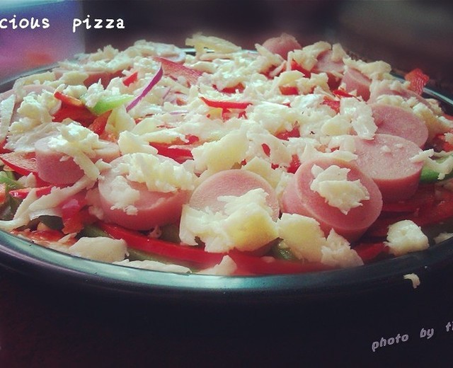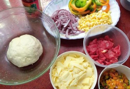 1高筋面粉140g2低筋面粉60g3温水100ml4油10g5糖12g6盐3g7干酵母3g8马苏里拉芝士200g可多可少9火腿肠适量10洋葱丝适量11青椒红椒黄椒适量12油适量13番茄酱45g