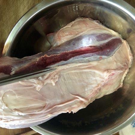 步骤2、把牛腱子表面的那一层皮竖向轻轻剪开,一条牛腱子,剪开三条缝就可以了。