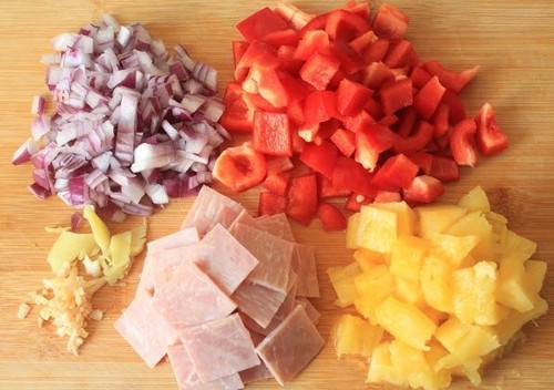 步骤1、洋葱、大蒜切碎,姜切片,柿子椒、火腿切成小片,菠萝切块。