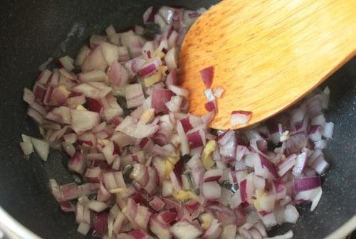 步骤2、锅中放花生油,油热后放洋葱、大蒜和姜,中小火炒大约5分钟,炒出香味即可。