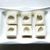豆腐切成小方块,中间挖出一个小孔。香菇切成末,姜切成末,葱切成葱花