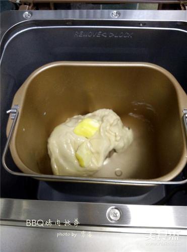 步骤1、将高筋面粉,低筋面粉,奶粉,清水,酵母,细砂糖放进面包桶里,启动“和面”程序;一个程序结束后,放入黄油,继续一个“和面”程序后,将面团覆盖上湿布放置温暖湿润处发酵;这个披萨饼的材料可以做两个8寸披萨饼底;