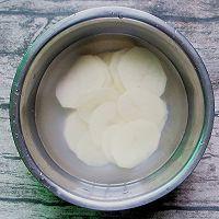 步骤2、 土豆去皮,切成薄片,用盐水浸泡