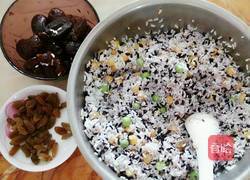 步骤1、事先将糯米,黑米,豌豆,红枣,荞麦用温开水分开浸泡五到六个小时,再将松子仁,葡萄干用温开水清洗干净,和煮熟的晾凉的粘玉米,浸泡好的糯米,黑米,荞麦,豌豆一同放入盆中,搅拌均匀(黑米要多清洗几次哦)!