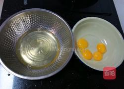 步骤1、把鸡蛋蛋黄、蛋白分别打入两个干净无水的盆里,蛋白盆要稍大点。