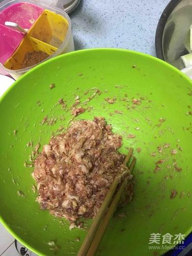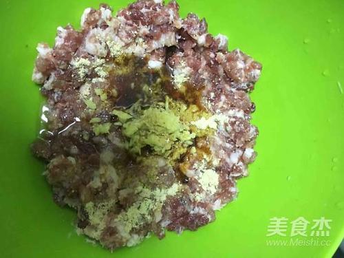 步骤1、猪肉馅➕盐➕鸡精➕料酒➕生抽➕姜末➕花椒粉,顺一个方向拌匀