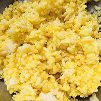 步骤2、 用两个鸡蛋黄放在放在米饭里搅拌均匀,锅里放油把米饭炒成金黄色,让每个米饭粒都分开备用。
