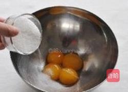 步骤1、蛋黄加10克砂糖用打蛋器搅打,搅打至砂糖融化颜色变浅,细腻浓稠后分别加入沙拉油和牛奶搅拌均匀,然后加入焦糖酱,再拌匀;
