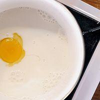 蛋奶糊制作:牛奶、蛋黄和45g糖倒入锅中搅匀。
