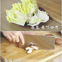 步骤2、 娃娃菜分开根和叶部分,切两半,注意不要切得太小,香菇切片。