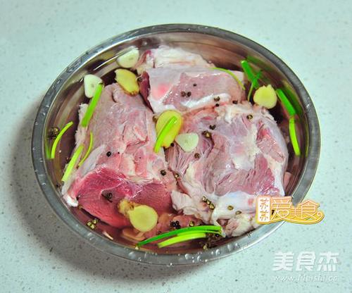 步骤1、牛肉洗净泡水4小时以上,中间要换水两三次。泡好的牛肉换上清水,在水中加入姜片、葱段、蒜片和花椒再泡1小时以上。