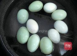 步骤2、将鸭蛋外壳刷洗干净,放入锅中,倒入清水,和鸭蛋持平即可。在水中加少许食盐,先用大火将水煮开,煮的时候将鸭蛋翻动数次,可让煮出来的蛋黄集中在蛋的中间。水开后再转小火,煮10分钟左右关火,再焖5分钟,鸭蛋就煮熟了。