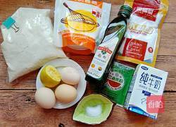 步骤1、准备好所有食材并称好配比。低筋面粉60g、红曲粉5g、牛奶35g、白砂糖分别准备15g和25g、橄榄油30g、鸡蛋3个、柠檬1片、盐少许。