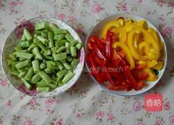 步骤2、芸豆洗净去头尾,掰断,黄椒、红椒洗净去籽切长条。