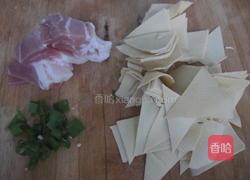 步骤1、猪肉切片,干豆腐切成三角形,葱切末