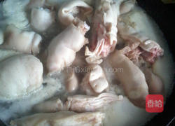 步骤2、将猪蹄分解成小块,放开水中煮10分钟左右,去掉其表面脏东西及腥臊味,捞出沥干水分,备用;