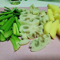 步骤2、 藕片,土豆,焯水两分钟分钟备用香芹,豆皮,(喜欢什么都可以)切条备用