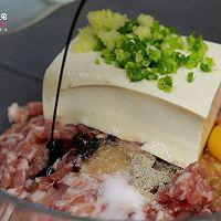 步骤2、 猪绞肉中加入鸡蛋、嫩豆腐、葱花姜末、盐3g、味精3g、白胡椒粉2g、料酒10g、老抽3g、生粉15g、芝麻油5g,筷子打散豆腐,和肉末搅拌在一起,顺时针搅拌均匀后摔打7-8次。