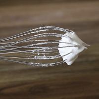 步骤2、 蛋白加入15克细砂糖打至硬性发泡。可以看到直立的大尖角。以前都说是小尖角,但是蛋白打太硬,混合的时候不太好搅拌,所以现在我都是打到大尖角的状态了。