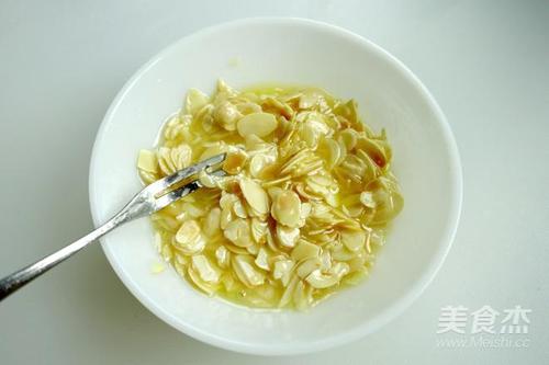 步骤1、做糖心: 黄油隔热融化后加入麦芽糖拌匀,再加入糖粉和烤香的杏仁片,拌匀备用。