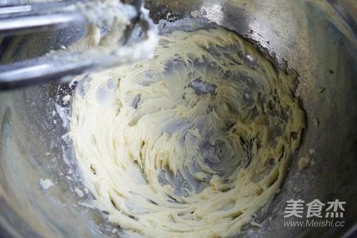 步骤2、做面糊: 软化的黄油加糖粉打散后分4-5次加入蛋白拌匀,每次搅打融合后再加下一次。