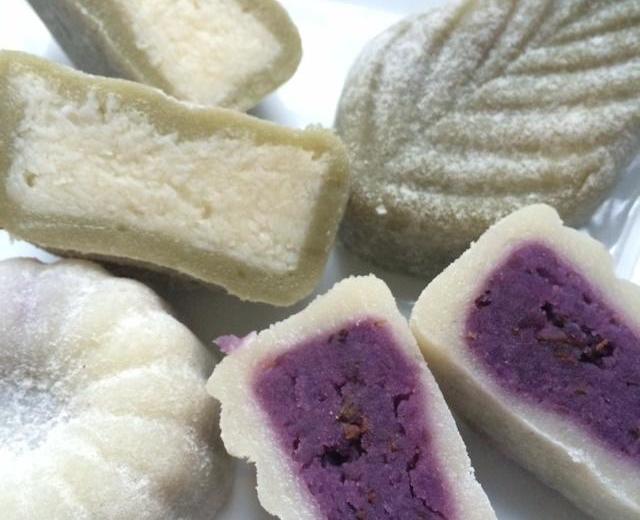 无味植物油40g糯米粉100g粘米粉大米粉100g小麦淀粉澄粉50g牛奶380g白糖按喜好60-80g紫薯馅紫薯500g油少许白糖按喜好糖桂花适量椰蓉馅椰蓉100g奶粉20g左右黄油20g左右白糖按喜好适量糯米粉20g左右手粉适量糯米粉炒制