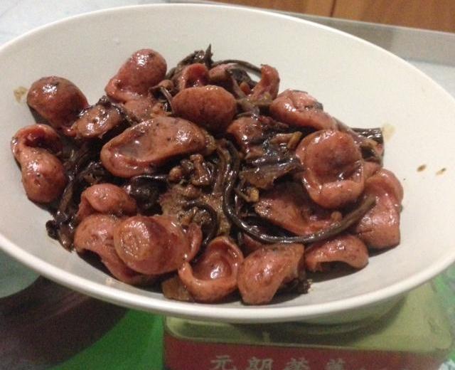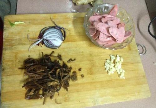 茶树菇1把黑椒味热狗肠4根洋葱1/4个蒜4瓣生抽1匙五香粉1茶匙豆瓣酱1匙盐少许