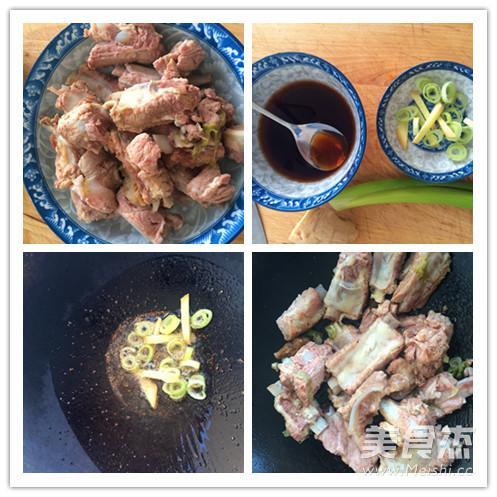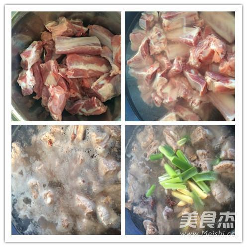 步骤1、排骨洗干净放在盆中,锅中加入凉水,把排骨放到锅中,一定是冷水下锅。把排骨用水煮一下捞出。锅中的水倒掉。锅中加入清水,等锅里面的水温热时,把排骨放入水中,水开时,打去浮沫,加入料酒、葱段、姜、大料、花椒粒。我是把花椒粒做成了花椒包放在里面的。煮30分钟,如果喜欢吃脱骨的排骨,可以再多煮一会儿。