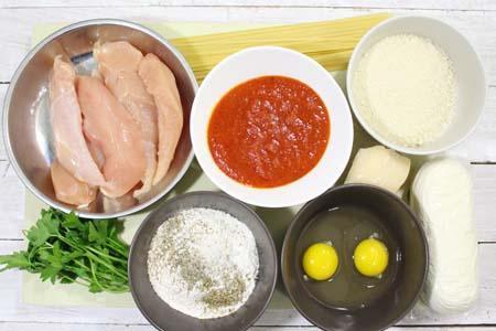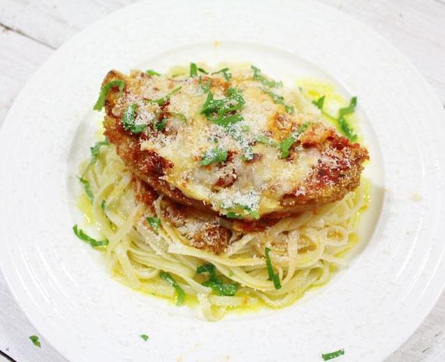 鸡胸肉用锤子或擀面杖锤扁650克新鲜马苏里拉奶BuffaloMozzarella撕成小块280克帕马森干酪ParmigianoReggiano半杯新鲜意大利香菜Parsley切碎1小把罗勒酱自制的或超市里卖的比较贵的樱桃番茄罗勒酱3杯海盐黑胡椒煎炸油煎炸油多用途面粉1/3杯蒜粉1茶匙干牛至Oregano1汤匙大鸡蛋2个日式面包屑1杯Linguine意面1磅