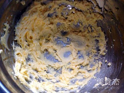 步骤1、在软化的黄油中加入糖粉,用电动打蛋器打发至蓬松,颜色发白