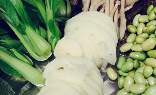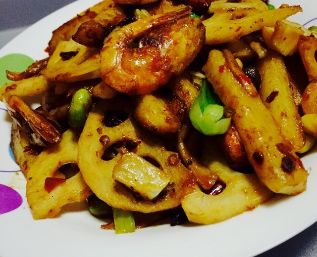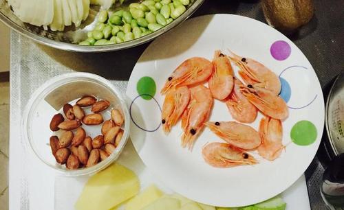 鲜虾半斤藕半根青笋半根土豆2个青豆适量蘑菇1墩青菜适量西葫芦可选葱姜蒜适量花椒适量麻椒适量辣椒3个郫县豆瓣酱1勺豆豉1/3勺火锅底料1勺半料酒1勺花生适量蚝油半勺糖半勺