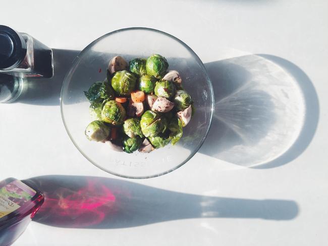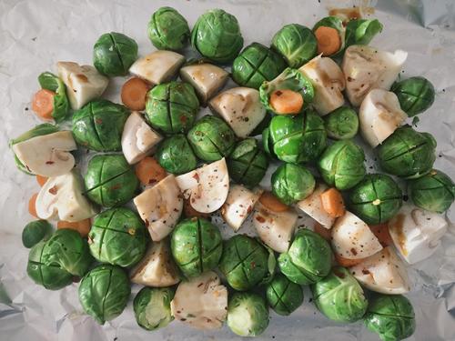 孢子甘蓝20个左右口蘑中等大小的7~8朵小胡萝卜一根橄榄油15ml蚝油1大勺黑胡椒粒适量粗辣椒面可选红葡萄酒醋10ml