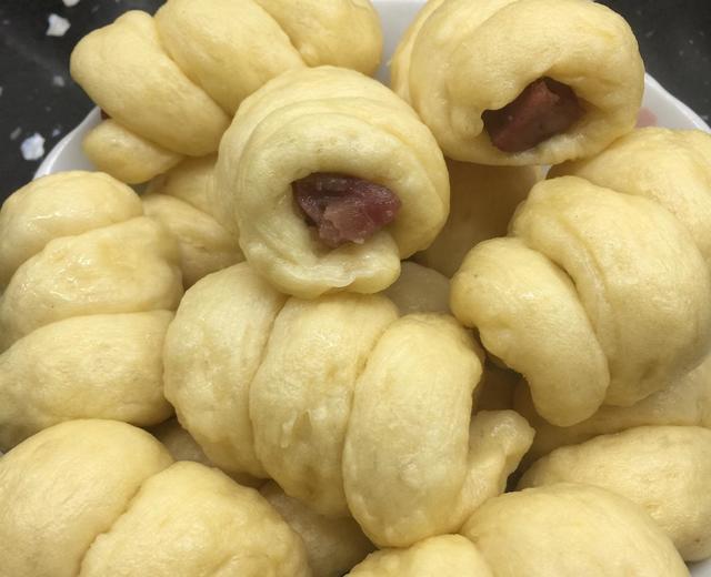 高筋面粉500g玉米糊100g酵母6g泡打粉3g白糖10g香肠3根温水350g36个量