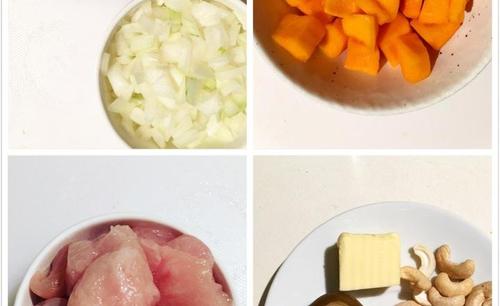 配料GaramMasala印度综合香料1小汤匙盐适量黑胡椒适量橄榄油适量黄油50g椰浆300ml番茄酱100g咖喱块一块葱姜蒜适量腰果100g主料鸡胸肉500g洋葱1个南瓜200g