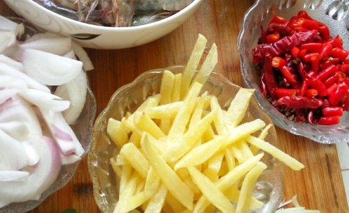 大虾500g土豆2个芹菜两根干红辣椒一小把小米辣8根洋葱一个姜葱蒜适量花椒一小把郫县豆瓣酱一勺八角两个香叶两片熟花生米一把白芝麻一小把青椒两个酱油少许白糖少许盐少许味精少许老抽几滴郫县豆瓣一勺