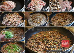 步骤2、取一干净炒锅,放入绞肉炒香至颜色变白,再放入香菇丝与所有调味料拌炒,随后再加入水煮至滚,转中小火续煮约40分钟。