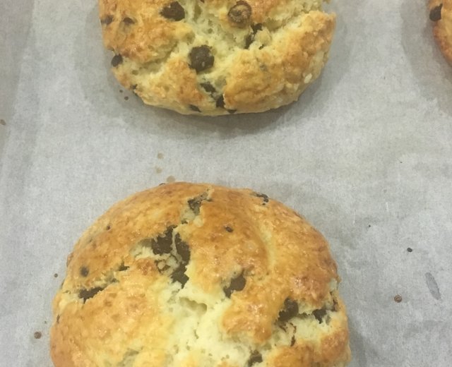 低筋面粉125g黄油30g牛奶奶油70g泡打粉3糖15g盐一小撮蛋液涂面用巧克力豆一把