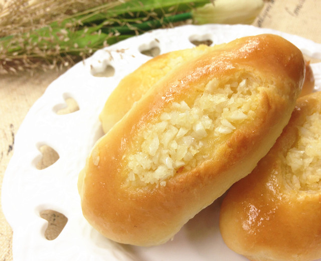 高粉150克低粉30克牛奶90克全蛋液20克砂糖15克盐1/4小匙酵母1/2小匙黄油15克馅料# 蒜泥35克黄油35克砂糖1/2小匙盐1/4小匙